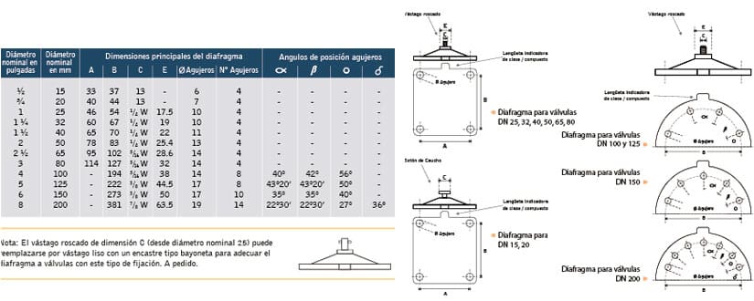 Dimensiones generales de los diafragmas para válvulas tipo vertedero