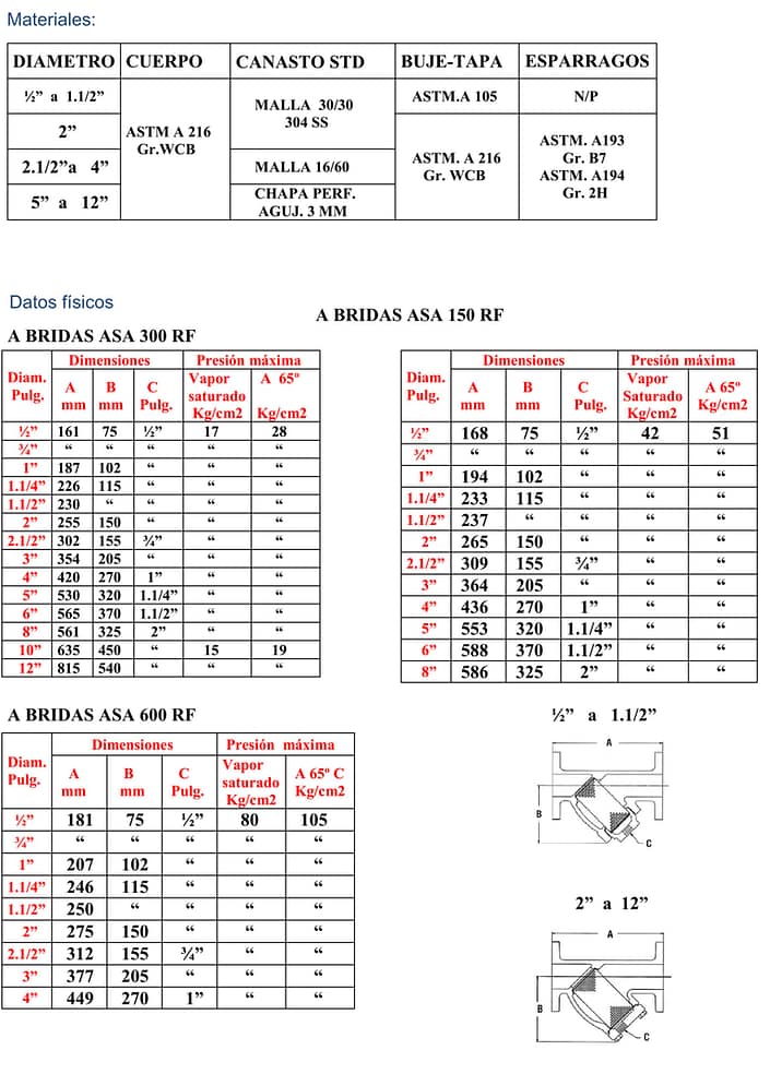 Cuerpo: Acero al carbono ASTM A216.Malla: Acero Inoxidable AISI 304. Con tapón para drenar. Minimiza la caída de presión inicial y maximiza el tiempo de limpieza. Diseño compacto de inicio a fin.