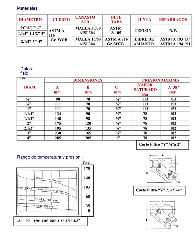 Los filtros tipo “Y” poseen un simple diseño y robusta construcción. Su gran área de filtrado implica que el mismo sea excepcionalmente eficiente. Sus partes internas son rápida y fácilmente accesibles. Los filtros tipo “Y” no solamente previenen el pasaje de material extraño, sino que constituyen un depósito donde éste es acumulado y luego fácilmente removido a través de su conexión de purga, la cual esta provista de un tapón roscado ó – a pedido se entregará-con una válvula para tal fin. Sus extremos de conexión pueden ser a bridas para soldar a tope buttweld (2″ – 12″), ó a enchufe sockettweld,o bien roscadas (1/2″ – 2″) NPT o BSPT. Los detalles constructivos pueden variar en función de las dimensiones y series. Para materiales posibles y una completa descripción de un filtro en particular comuníquese con nosotros.