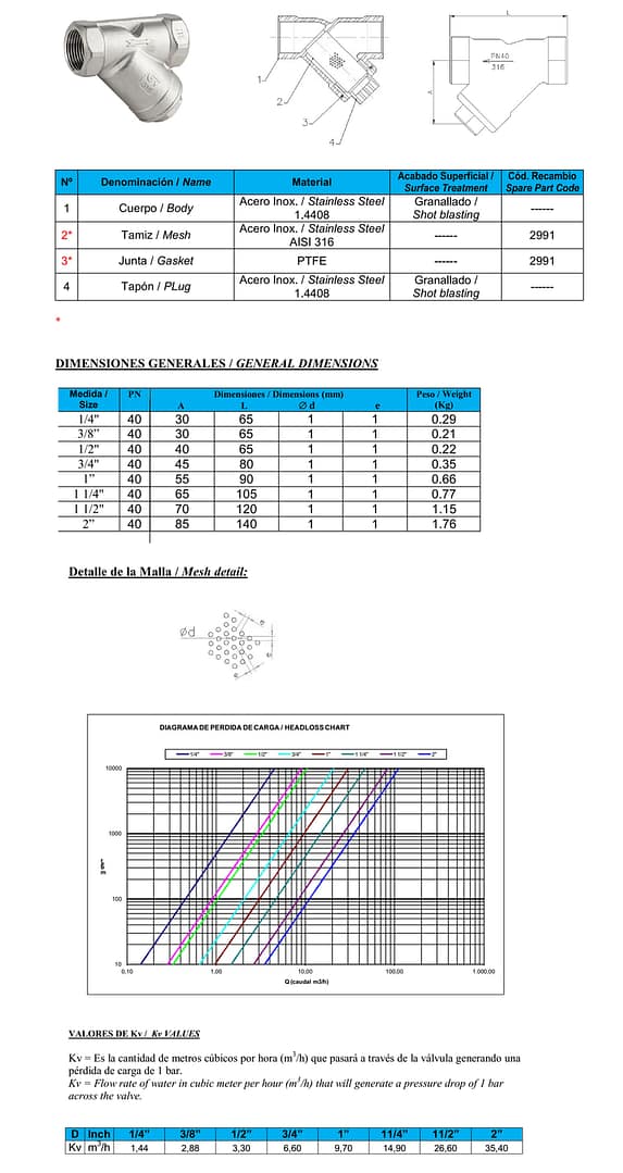 Filtros Tipo Y acero inoxidable roscado poseen un simple diseño y robusta construcción. Su gran área de filtrado implica que el mismo sea excepcionalmente eficiente. Sus partes internas son rápida y fácilmente accesibles. Los filtros tipo “Y” no solamente previenen el pasaje de material extraño, sino que constituyen un depósito donde éste es acumulado y luego fácilmente removido a través de su conexión de purga, la cual esta provista de un tapón roscado ó – a pedido se entregará-con una válvula para tal fin.