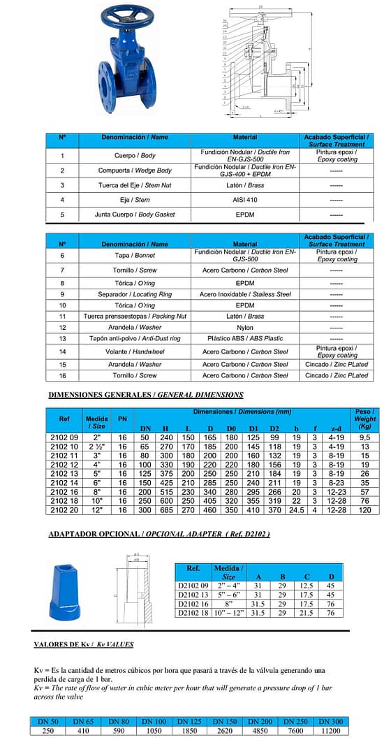 Válvula Esclusa con cierre de EPDM y cuerpo de fundición nodular PN 16 Vástago fijo. Diseño según DIN 3352, DIN 2501, DIN 3202-F4 apta para conducción de agua. Temp. máx. de trabajo 80ºC.