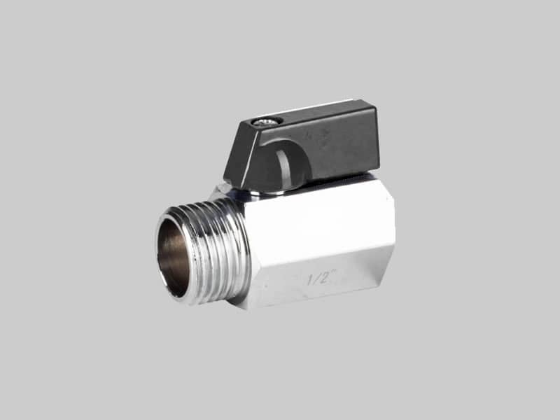 Válvula mini esférica macho-hembra  PN 16. Paso reducido. Construcción en latón cromado UNE-EN 12165. Asientos PTFE. Barra hexagonal cromada. Extremos rosca gas (BSP) M-H – según ISO 228/1. Temp. máx. 110ºC. Mando palomilla aluminio.