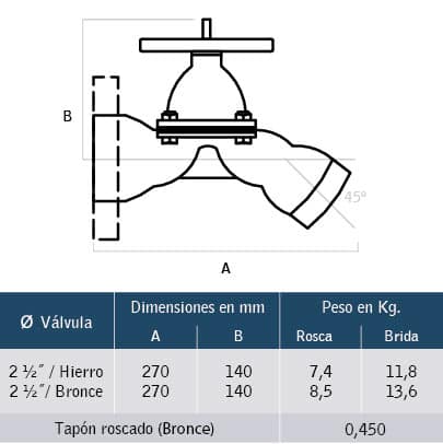 Su cuerpo, con conexión a la línea a brida ASA 150 o rosca hembra BSP 2 1/2″ y toma acodada a 45º con conexión rosca macho whitworth de 5 hilos/pul o hembra BSP 2 1/2″ fabricados en bronce o hierro.