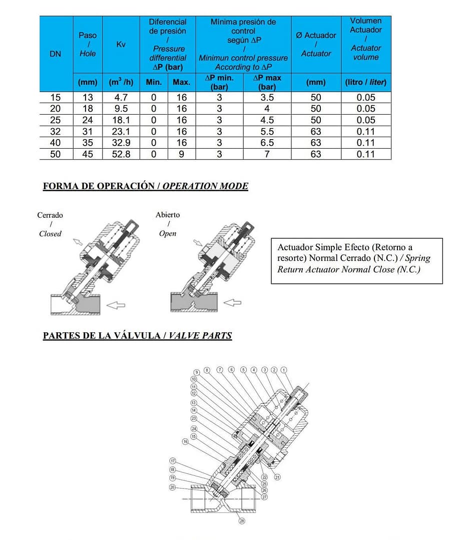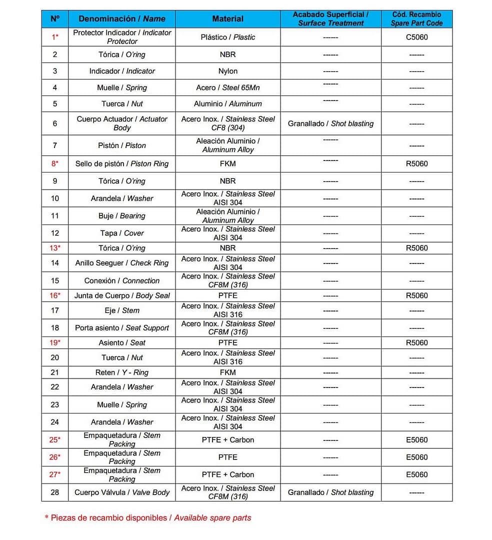 Extremos rosca gas, PN-16. Const.: acero inox. AISI 316 microfusión. Junta actuador: NBR. Presión mando. Actuador: 3-10 kg/cm2. Rango temp. trabajo: -10ºC +180ºC.