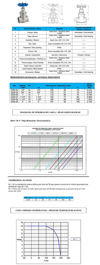 Juntas: PTFE. Conexión: rosca gas ISO 7-1 (EN 10226-1). Presión máx.: 16BAR a 120ºC – 10 BAR a 180ºC. Temp. mín. -30ºC.