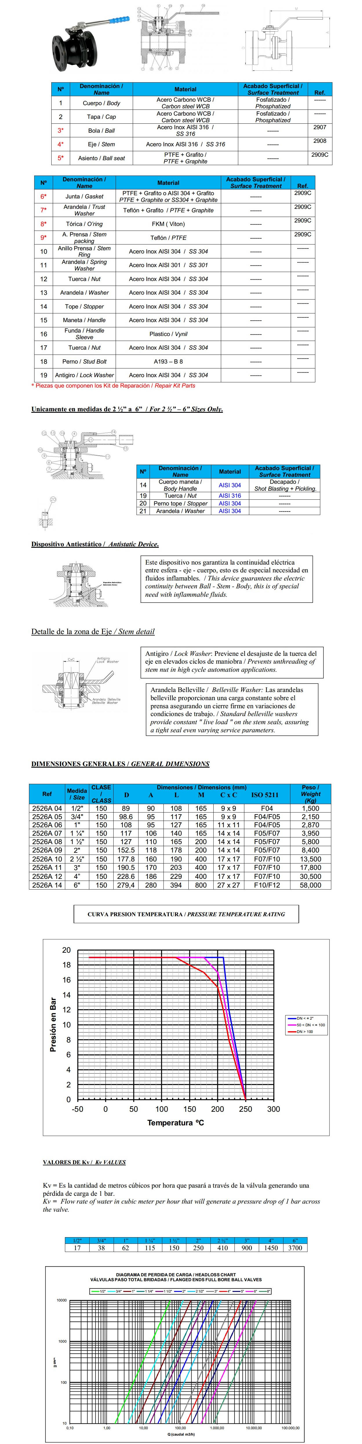 Válvula esférica 2 piezas Acero al carbono conexión bridada : Montaje directo de actuadores s/ISO 5211. Diseño fire safe. Dispositivo antiestático. Cuerpo: acero al carbono WCB (microfusión). Esfera y eje: AISI 316. Asientos: PTFE + 25 % Grafito. Tórica eje: vitón. Presión máx.: 19 kg/cm2. Temp. -30ºC +220ºC. Mando manual por palanca con sistema de bloqueo.