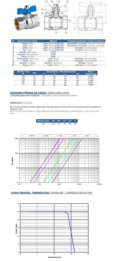 Válvula esférica mando tipo moño PN 25. Paso total. Construcción en latón UNE-EN 12165 cromado. Asiento PTFE. Extremos rosca gas (BSP) H-H. ISO 228/1. Temp. máx. 110ºC. Mando manual por palomilla aluminio.