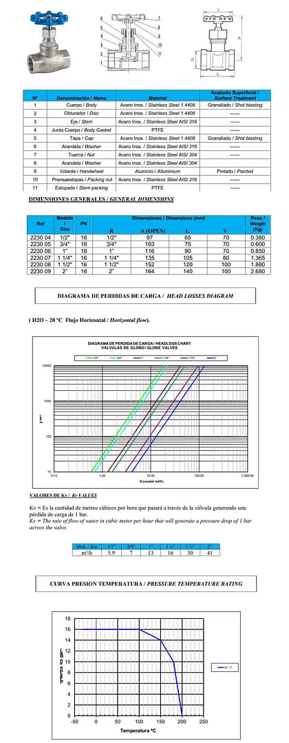 Construcción: inox. CF8M (316) microfusión. Juntas: PTFE conexión: rosca gas ISO 7-1 (EN 10226-1).