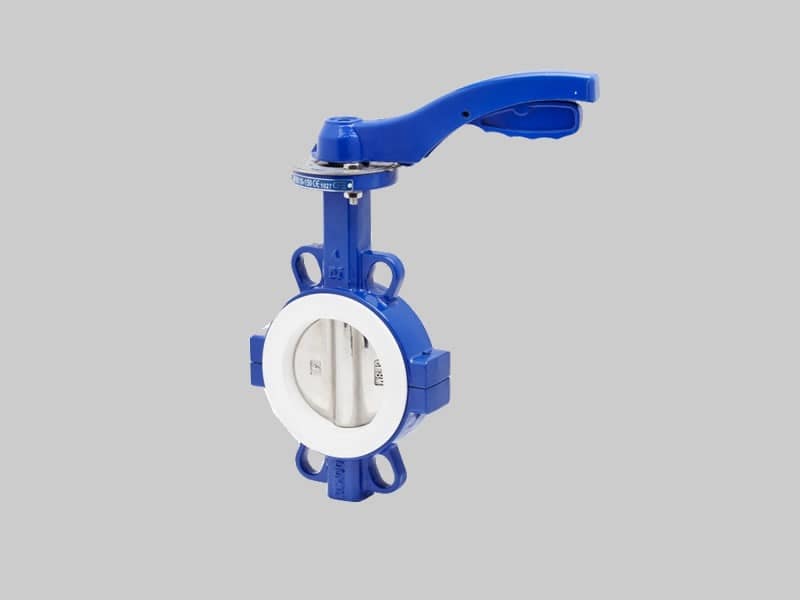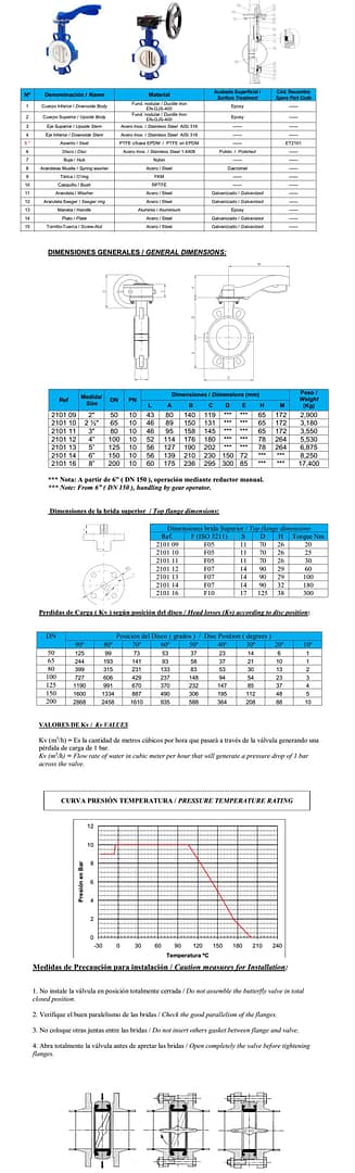 Válvula mariposa wafer Hierro / Ptfe PN 10/16 – ANSI 150 lbs Cuerpo fundición nodular GGG-40. Eje y disco: Inox. 316.