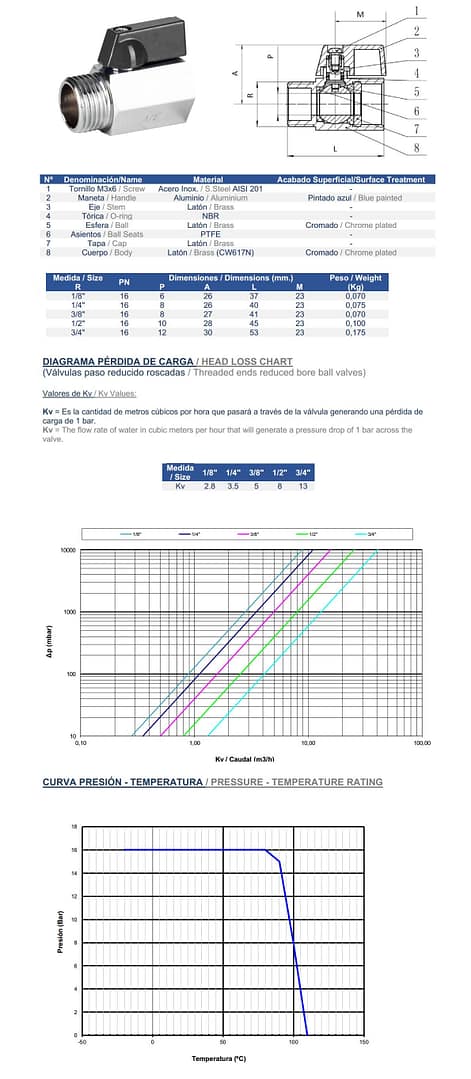 Válvula mini esférica macho-hembra PN 16. Paso reducido. Construcción en latón cromado UNE-EN 12165. Asientos PTFE. Barra hexagonal cromada. Extremos rosca gas (BSP) M-H – según ISO 228/1. Temp. máx. 110ºC. Mando palomilla aluminio.